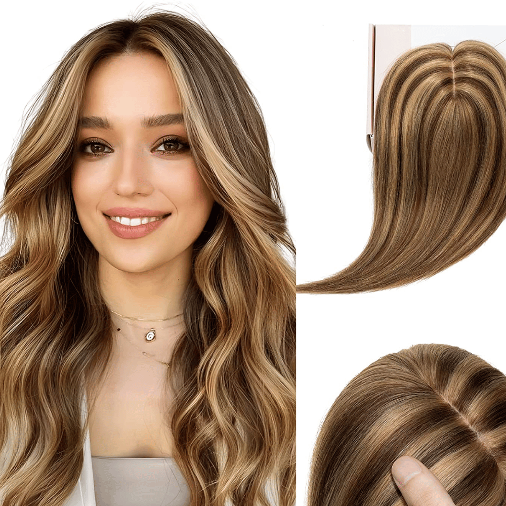 Elailite Hair Toppers for Women with Thinning Hair. Real Human Hair V3.0 Clip in Hair Pieces 12 Inch 120% Density Middle Parting for Hair Loss Cover Gray Fine Hair [Style-B Silk Top 4.7 Inch*3.9 Inch] #4 Chocolate Brown mix #27 Dark Blonde!